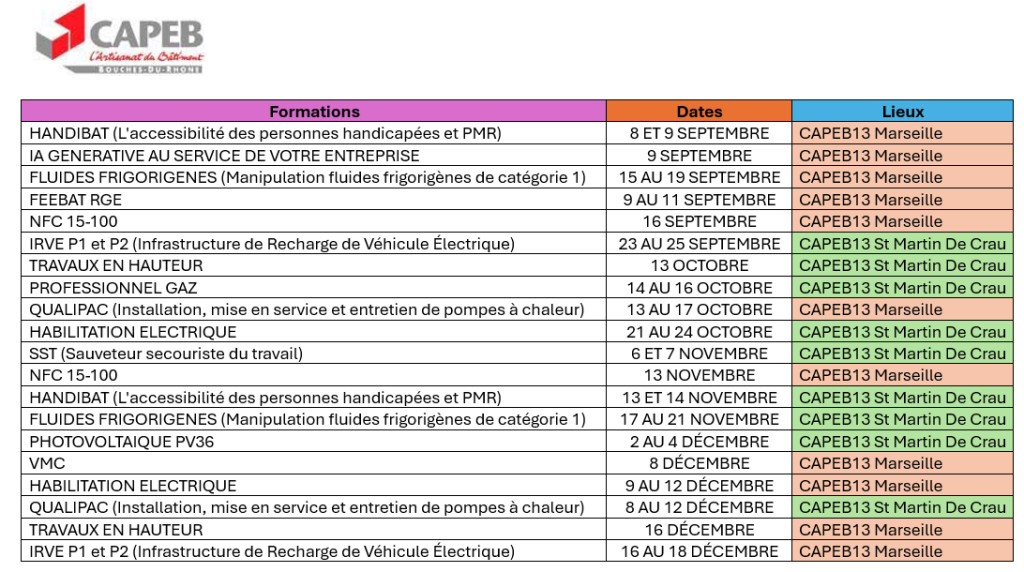 Si vous êtes intéressés ou pour tout renseignement complémentaire, vous pouvez consulter ci-dessous le planning prévisionnel ou prendre contact auprès de nos services. contact 0491323346 formation@capeb13.fr